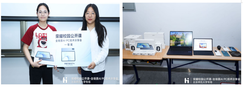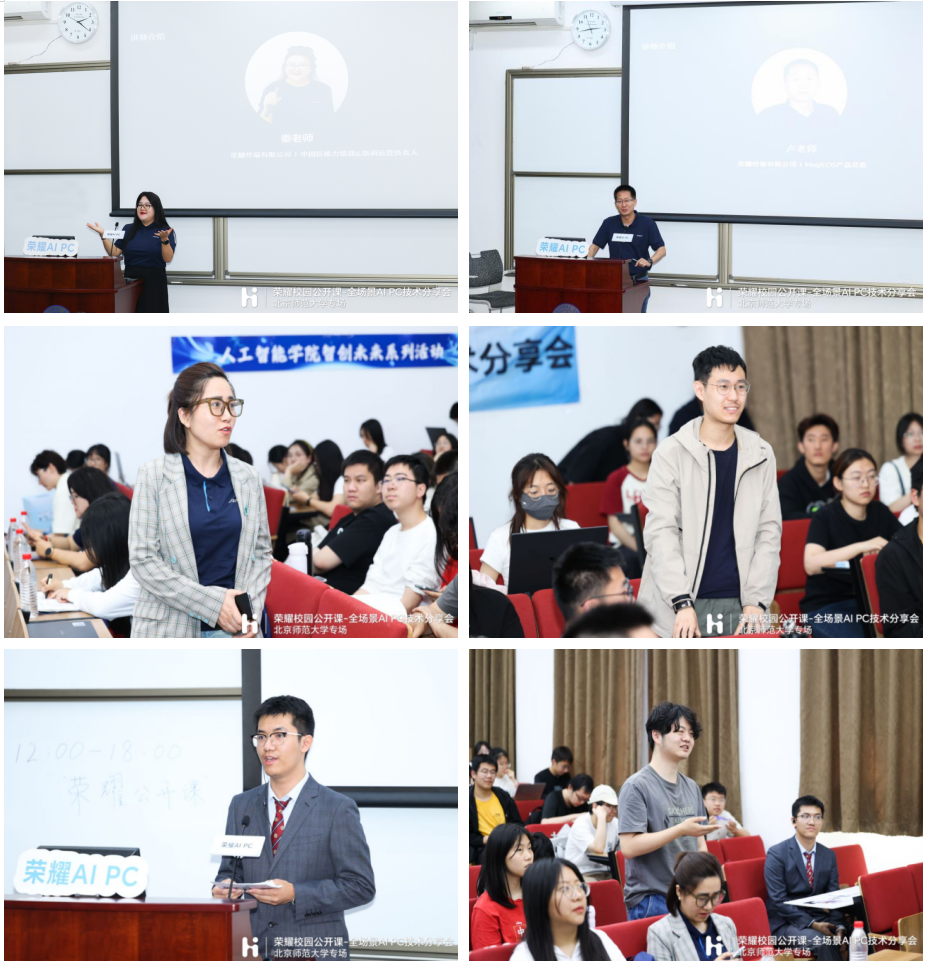 2024年5月11日,由北京师范大学和荣耀终端有限公司联合举办的“智创未来”第十五期暨荣耀校园公开课-全场景AI PC技术分享会成功举办。活动吸引了校内众多师生的关注,同学们近距离接触并了解到AI技术在笔记本电脑领域的最新发展。