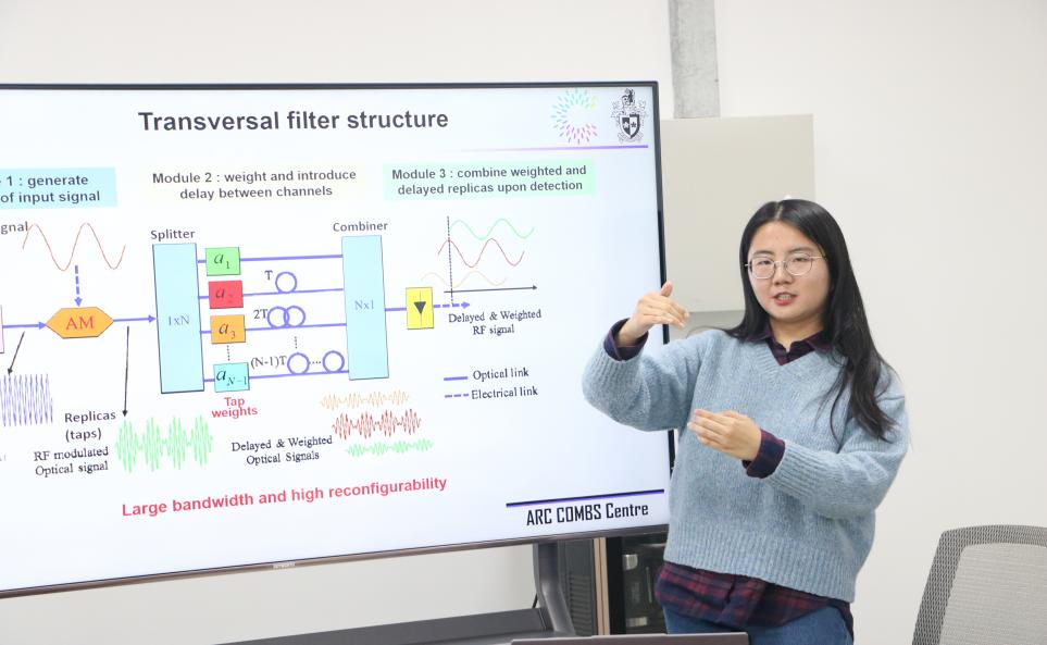 孙老师介绍了射频光子学、光学微梳以及光神经网络的基本概念;随后着重介绍了光学微梳在高速射频信号处理领域的显著优势,其能够有效提升信号处理的效率与精确度,为通信技术、数据处理等领域开辟了新路径。孙老师详细讲解了光学微梳在光神经网络的卷积加速器的应用,展现了这一前沿技术对于加速人工智能算法执行、优化神经网络性能的巨大潜力。孙老师热情介绍了ARC COMBS Centre,诚挚邀请有志于该领域研究的同学们加入,共同探索未知,推动科技进步。