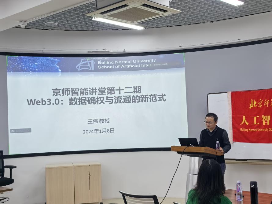 2024年1月8日,bet365中国-bet365中国app 京师智能讲堂第十二期在海淀校园成功举行,同学们积极参与,本次讲座特邀北京交通大学教授、博士生导师王伟教授,以“Web3.0:数据确权与流通的新范式”为题进行学术报告。