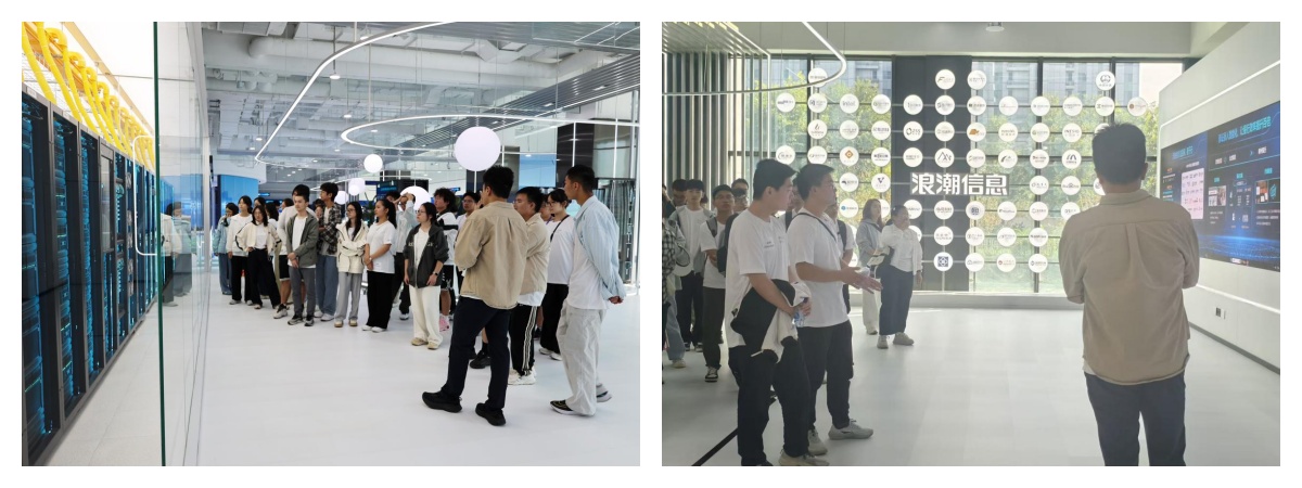 在浪潮信息相关负责人的陪同和介绍下,同学们系统参观了企业展厅,深入了解其作为领先的IT基础设施提供商的发展历程与战略布局。自成立以来,浪潮信息始终致力于计算技术的创新与产业落地,业务覆盖智能计算、云计算、大数据等领域,在服务器、存储、AI加速、算力平台等方面全方位发展,为我国数字化转型和数字经济构建提供了坚实支撑。现场,同学们近距离观摩了“智能计算”“绿色计算”等多项关键技术在实际场景中的应用演示,并接触了EPAI元脑启智企业大模型开发平台等前沿产品原型。工程师团队以专业视角分享了AI模型训练、推理部署及行业落地的实践经验,令同学们深受触动。