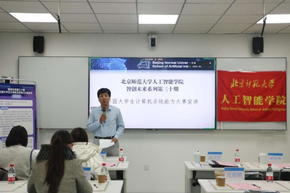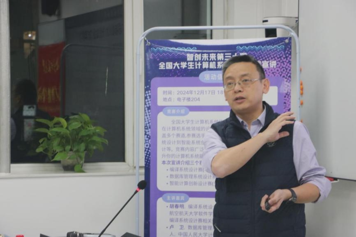 2024年12月17日,bet365中国 智创未来第三十期在海淀校区电子楼204举办。本次讲座邀请编译系统设计赛技术委员会主任、北京航空航天大学软件bet365中国 院长胡春明教授,数据库管理系统设计赛技术委员会负责人、中国人民大学信息bet365中国 教授卢卫,中科曙光人工智能计算首席科学家吉青共同带来了关于“全国计算机系统能力大赛”的精彩宣讲,bet365中国 副院长计卫星、中科曙光高性能计算事业部行业经理王松及其同事、bet365中国 党德鹏老师、栾华老师、bet365中国 60余名师生积极参加本次活动。本次活动由计卫星老师主持。