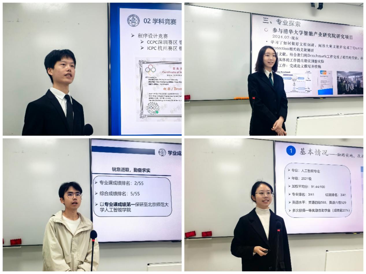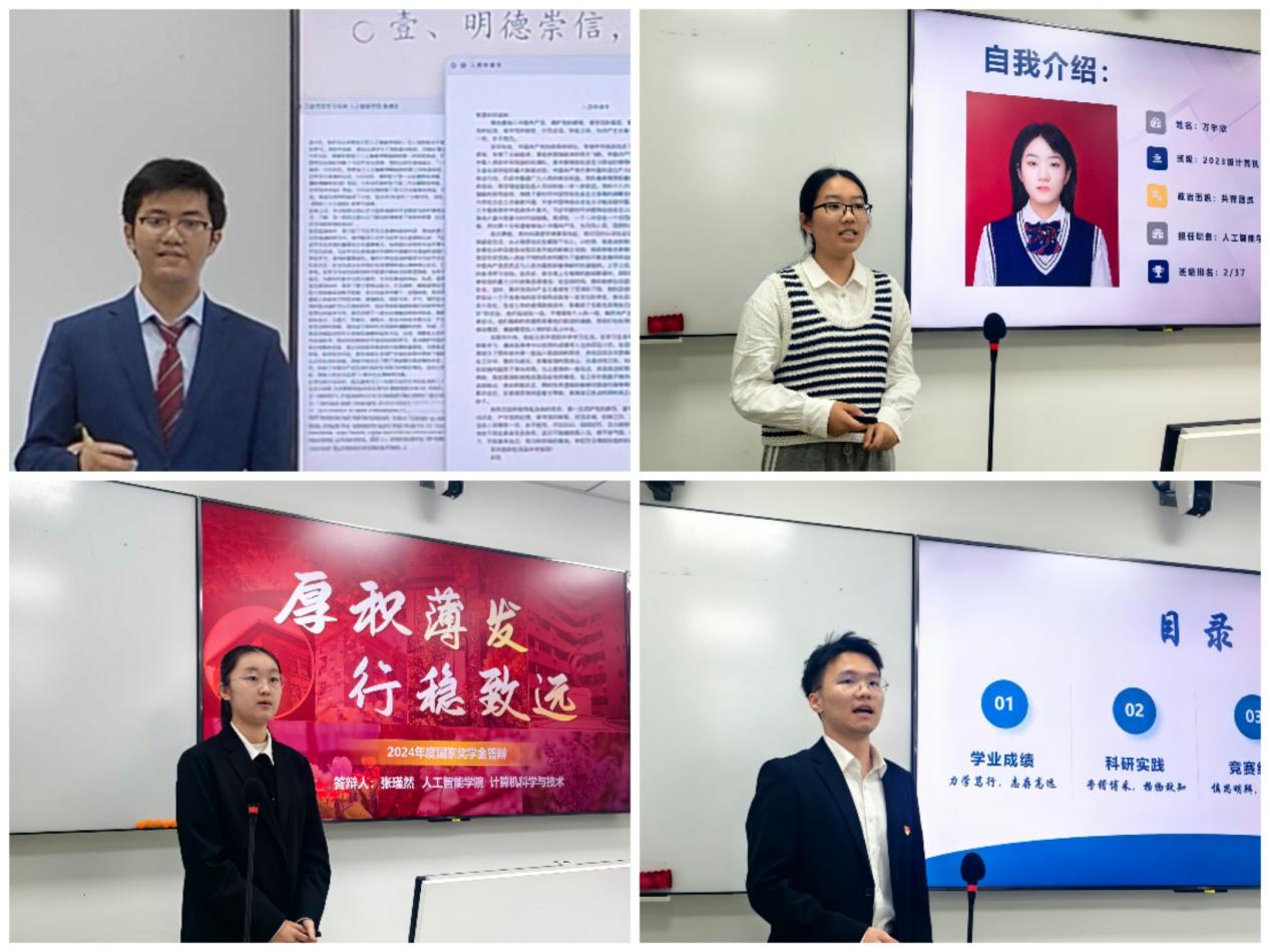 国奖师生评委、候选人和各年级观摩同学齐聚电子楼。首先由刘治驿老师介绍本次答辩的流程以及评审规则,然后每位候选人依次进行答辩,展示自己在思想品德、学业学术、综合素质、社会贡献等的综合表现。每位参评同学发言结束后,评委老师对其进行提问交流,同学们都对答如流,展现了良好的综合能力。