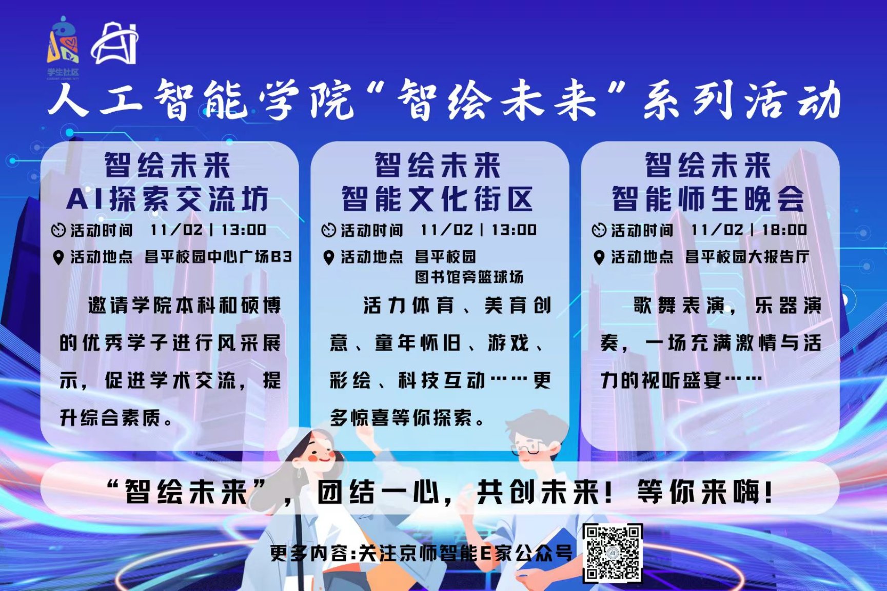 2024年11月2日,人工智能学在昌平学生社区举办“智绘未来”系列活动,活动分为AI探索交流坊、智能文化街区、“智绘未来”师生晚会三个模块,共计600余人次参加。
