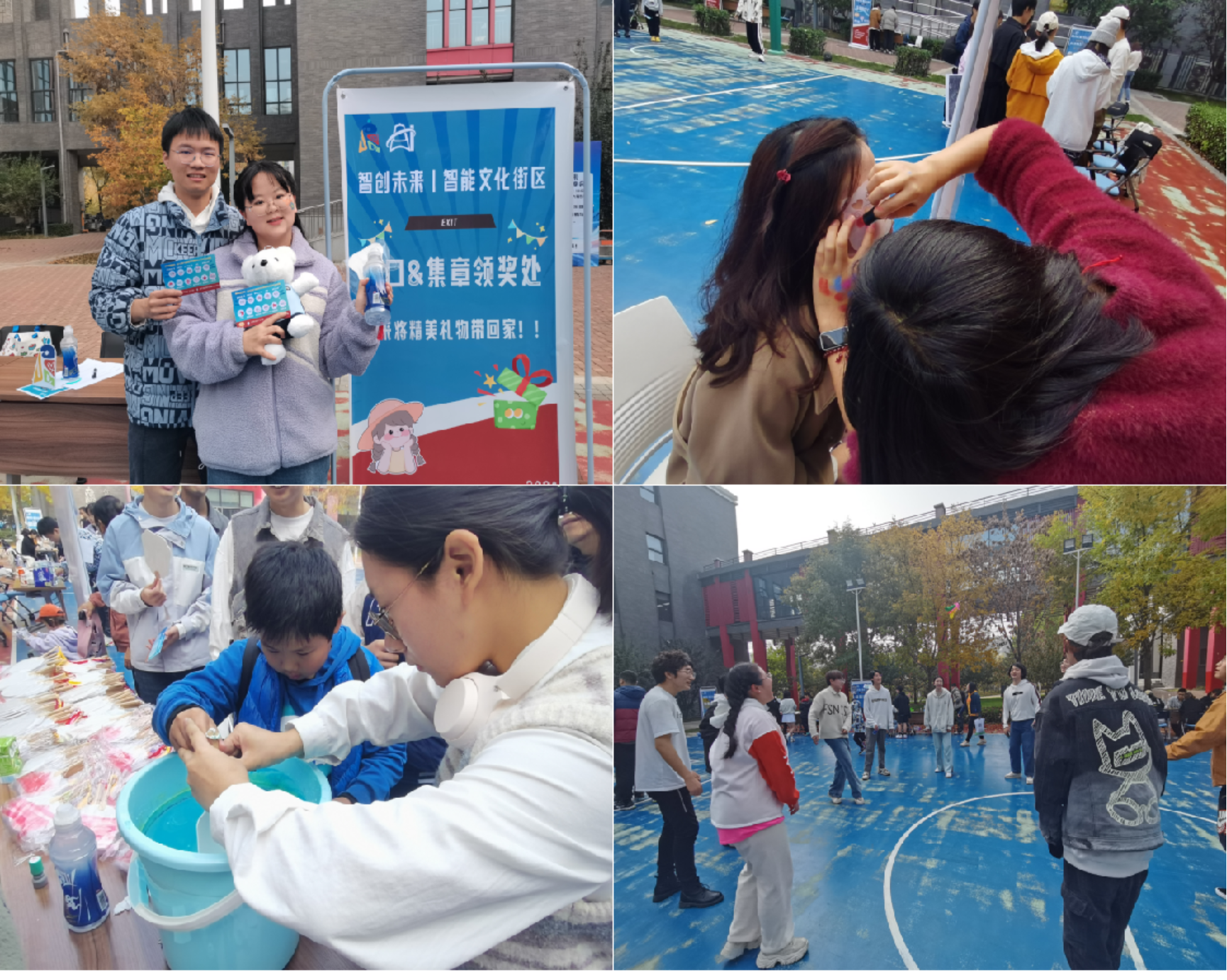 “智能文化街区”外场活动共社设11个展位,包括“童年游戏区”体验各色游戏、漆扇制作、人脸彩绘、球王争霸、镖尖飞扬、体感游戏机、棋王争霸、“追寻童年记忆”童年游戏大赏、自制棉花糖等,活动以游园形式开展,参与同学在每个展位体验活动并盖章认证领奖。活动现场气氛热烈,体现了新技术和旧时光的交融,展示了bet365中国 师生的活力。参与师生表示,通过活动感受到了昌平校园的美景和bet365中国 的团结凝聚,希望未来继续在昌平学生社区参加师生喜闻乐见的活动。