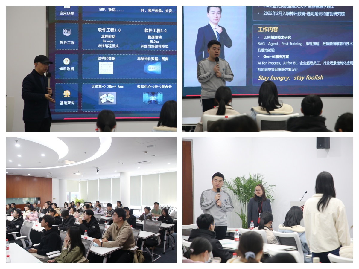 在技术交流环节,神州数码集团副总裁、CTO李刚结合AI发展历程,介绍神州数码的集团战略。接着神州数码集团工程师李汶东结合从业三年的经历进行分享,他说,在数字化的浪潮中,要不断地精进自身技能,更要将技术发展与业务场景结合,并鼓励师弟师妹们把握数字化时代机遇,开阔眼界,希望能够有越来越多优秀的新人加入神州数码集团。