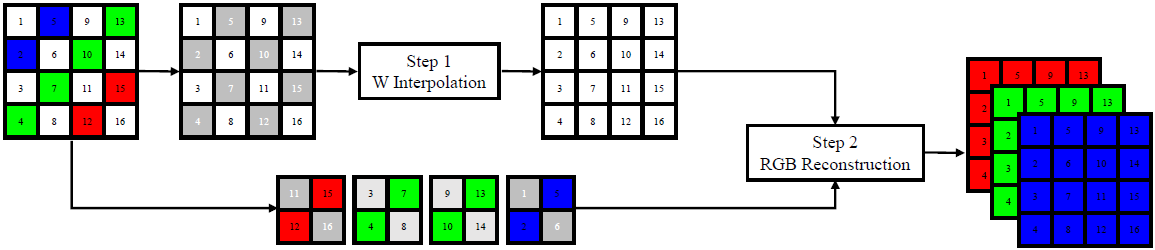 2023年6月19日,智能媒体计算课题组在IEEE Transactions on Image Processing发表了题为《Universal Demosaicking for Interpolation-Friendly RGBW Color Filter Arrays》的研究论文。该论文(1)针对RGBW彩色滤波阵列中W像素信噪比高、比例占优的特性,提出一种两阶段去马赛克算法,即首先恢复W通道,而后以恢复的W通道为参考重建RGB通道。该算法可以应用于任意的W占优的RGBW彩色滤波阵列;(2)根据图像的二阶偏导数比一阶偏导数更为平滑,提出一种高效的W通道插值算法,同时加入减少混叠效应的步骤,进一步增强W通道的恢复效果;(3)提出利用引导滤波系数来构建图像在不同尺度时的不变性,并据此提出一种带掩码的引导滤波算法,以恢复的W通道为参考重建RGB通道。算法流程图见图1.
