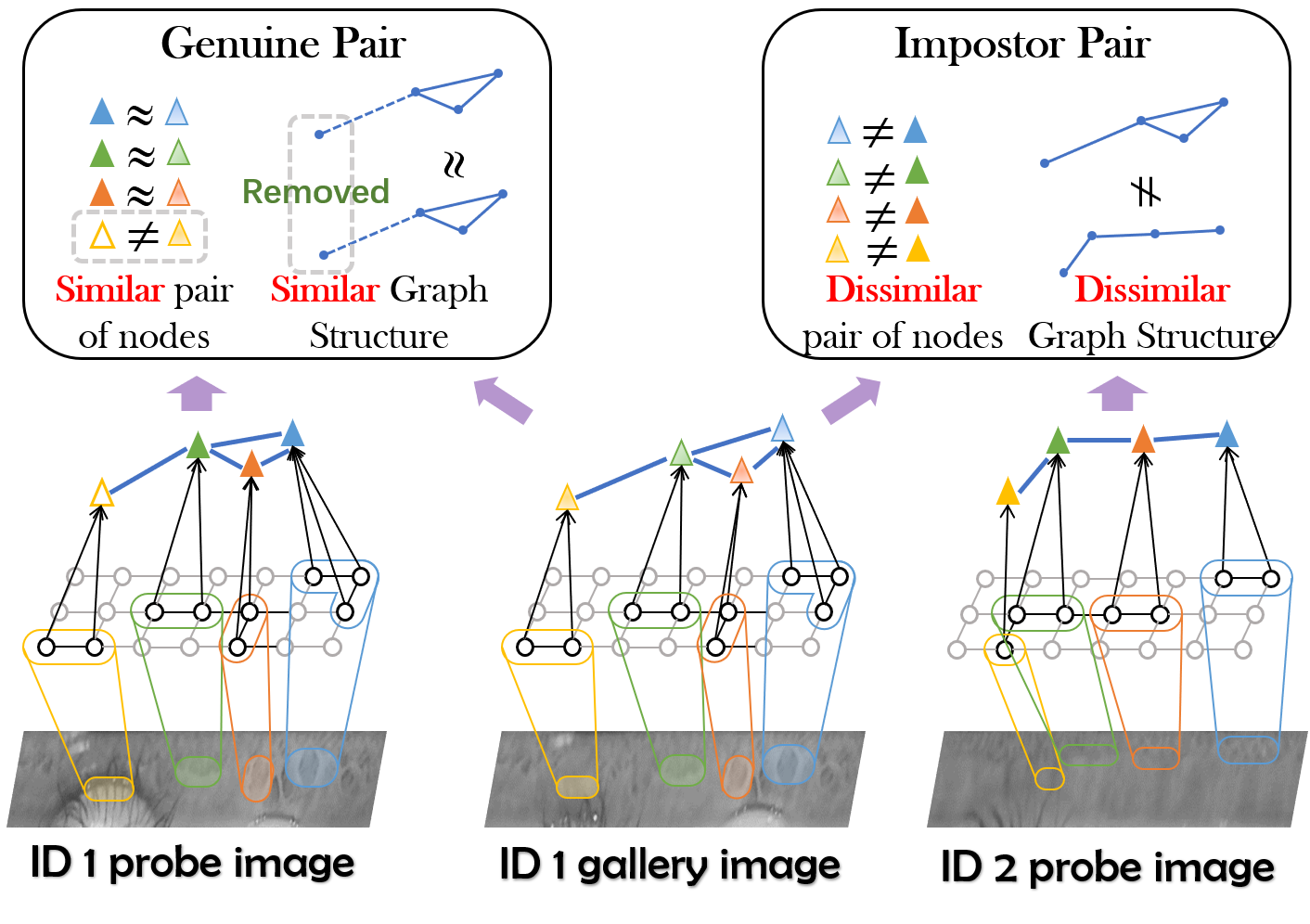 该论文针对生物特征识别中的遮挡问题进行了深入研究。遮挡是真实场景下的生物识别的常见挑战。由于遮挡的不利影响,深度神经网络的泛化能力大大降低。为此,该研究提出了一种新的生物特征表达框架,将卷积神经网络和深度图模型的优点相结合,以克服生物识别中的遮挡问题,称为多尺度动态图表示方法Multiscale dynamic graph representationMS-DGR)。卷积神经网络生物特征样本的子区域特征建模为高层特征表达,进而通过深度图模型将这些特征进行重新组织,得到特征图Feature graph,FG)。FG内的每个节点包含了输入样本的特定局部区域的特征模式节点之间的则表达了生物特征样本中局部特征模型的共现关系。通过分析节点表示的相似性以及邻接矩阵之间拓扑结构,论文所提出的框架能够利用动态图匹配来自适应地丢弃与被遮挡部分相对应的节点。在此基础上,改模型进一步结合了多尺度策略,以获得代表不同尺度的特征模式特征表达。此外,通过节点以及拓扑结构的匹配关系该研究所提出的框架能够显式地表达识别模型的决策一句,显著增强了模型的可解释性